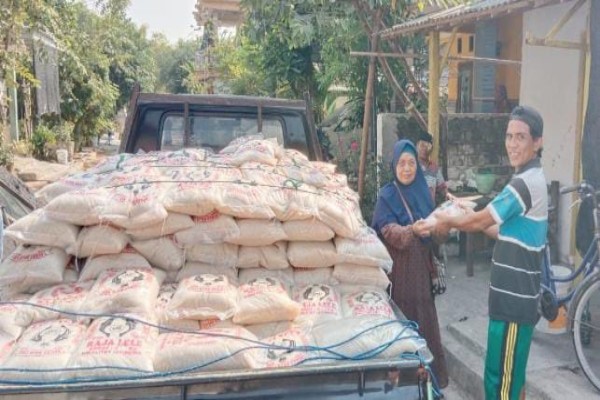 Diangkut keliling menggunakan mobil bak terbuka, tak kurang sebanyak 420 paket beras kemasan 5 kg itu dibagikan oleh Kades Suminto kepada setiap rumah warga desanya.