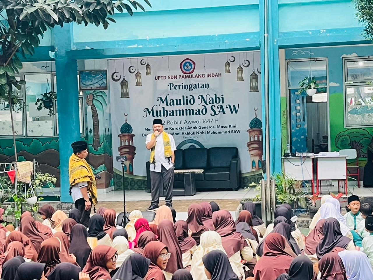 Tangsel | antarwaktu.com – Dalam rangka memperingati hari kelahiran atau Maulid Nabi Muhammad SAW yang bertepatan dengan 12 Rabiul Awal 1447 H, UPTD SD Negeri Pamulang Indah menggelar Peringatan Maulid Nabi, Jumat (19/09/2025).