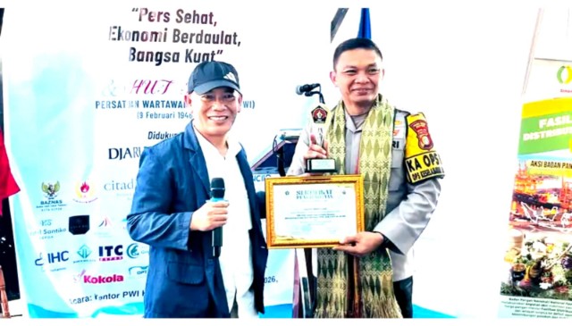 PWI Kota Depok memberikan penghargaan ke- 12 Pejabat dan Tokoh Informatif, salah satunya kepada Kapolres Metro Depok Kombes Pol. Abdul Waras, dengan kategori Bhayangkara Sahabat Pers dan Teladan Komunikasi Publik Kapolres Metro Depok di Kantor PWI Kota Depok, Kamis (12/2026).